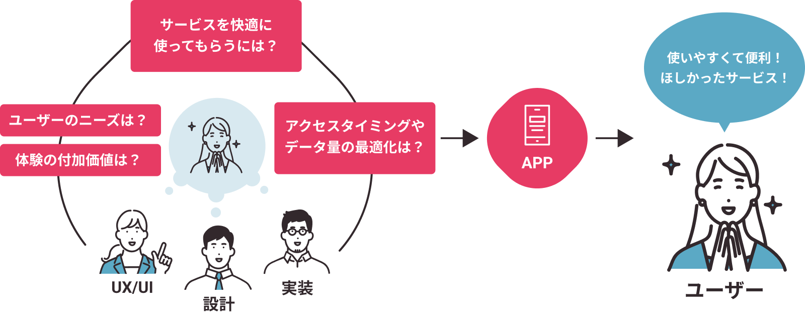 スマートフォンアプリはその事業やサービスに対して認知があるユーザーに提供されるべきものとして捉え、ダウンロードに至るニーズが顕在化しているといえます。そういったユーザーに対し、利便性を追求することが重要であると考え体験設計・開発を行っております。また、アプリとサーバー間の通信においても、ただ通信ができるだけでなく、アクセスのタイミングやデータ量を想定・調整した設計にすることでいつでも安定した通信速度を維持するなど、ユーザーの利用シーンを想定し、常にユーザーが快適と思えるアプリ体験を創り出します。