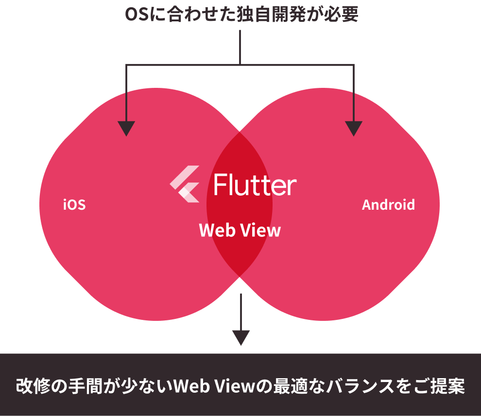 昨今の流れの速いシーンにおいて、スマートフォンアプリは一度リリースして終わりではなく、運用更新を意識する必要があります。よってソニックムーブでは、テストやリリースの自動化にも取り組みながら、効率的に対応できる運用体制をご提供しております。一例として、スマートフォンアプリが出た当初よりなされているネイティブ開発に加え、Webビューを活用することによるコストの最適化がそれに当たります。また、Android OSとiOSでの開発の共通化も推進しており、特にFlutterというフレームワークに注目し採用しています。