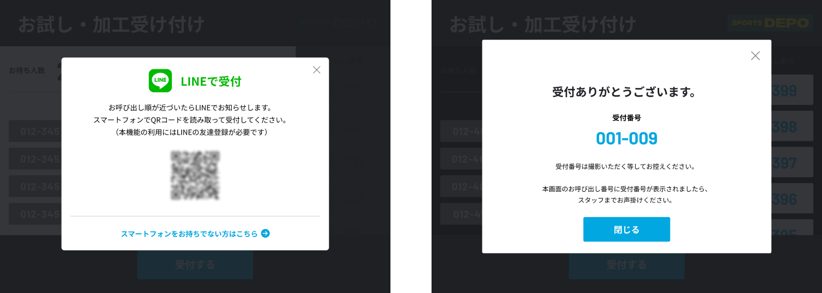 お客様は店頭に置かれたタブレットにて操作を行い、表示されるQRコードをスマートフォンで読み込むことでLINE上にて受付を行います。氏名や受付に必要な項目を入力すると整理番号が発行され、待っている人数が表示。時間になるとLINEのメッセージにて通知します。これらにより、自動化による業務効率の向上に加え、呼び出しまでの間他のフロアを見て頂くことによる店内回遊の促進にもつながりました。