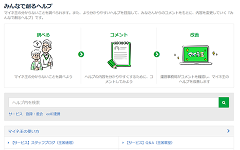 マイネ王の活発なコミュニケーション性をヘルプにも投影。従来までの「ただ置いてあるヘルプ」ではなく、ユーザー様のご意見を取り入れて日々進化していく「動きのあるヘルプ」を目指しました。