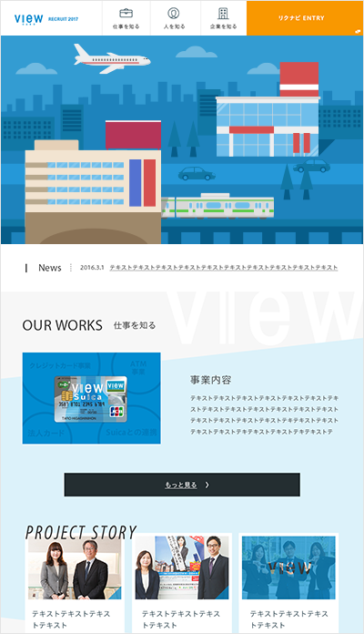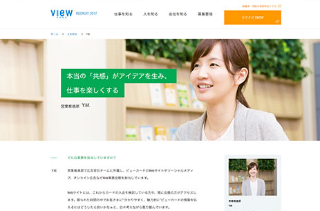 「ビューカードさまが持つ、人柄の良さを伝えられるようなサイト」をメインコンセプトに設定。表情のある写真を多用するといったデザイン面での工夫や、企業の雰囲気を正しく伝えられるようなインタビューを掲載し、親近感や共感を足掛かりにエントリーに結び付けられるようなストーリーづくりの提案を行いました。
